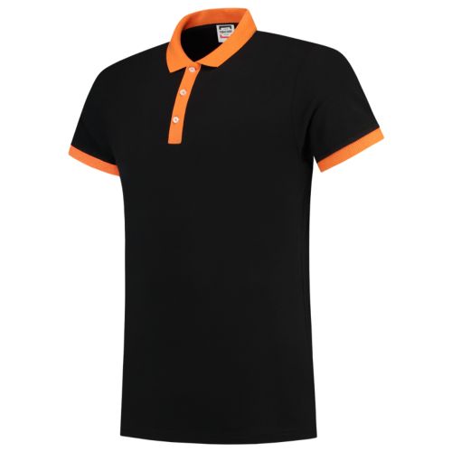 This two-tone fitted polo shirt combines a neat, serious black or navy with a narrow and stylish collar in the color of your choice. This polo shirt is available in a wide range of sizes (XXS-8XL).
