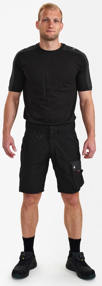 Functional shorts with lots of details. Optimum fit, with panel on the inseam for greater comfort. Two spacious, slanted slit pockets at the front. Loop with D-ring (front) for attaching an ID card. Two spacious back pockets with flap and Velcro fastener. Thigh pocket with zipper pocket for cell phone, additional small pocket. It is spacious and provides more freedom of movement thanks to the free-hanging bottom. Reinforced ruler pocket at the bottom with additional compartments. The ruler pocket also has a free-hanging bottom. Suitable for industrial laundering.