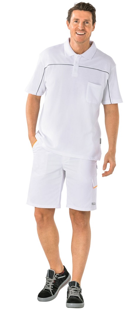 2 set-in pouch pockets, double ruler pocket, left thigh pocket with flap and Velcro fastener, mobile phone pocket, elastic waistband, 2 back pockets with flaps, zipper in trouser fly, pocket openings and pocket flaps with colored piping set off.
