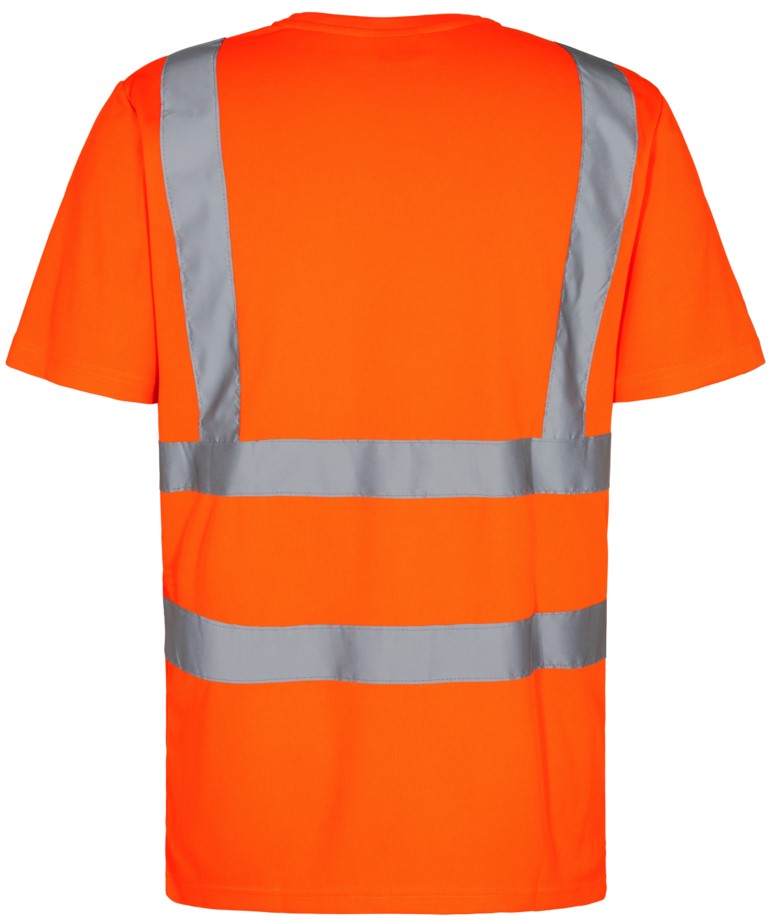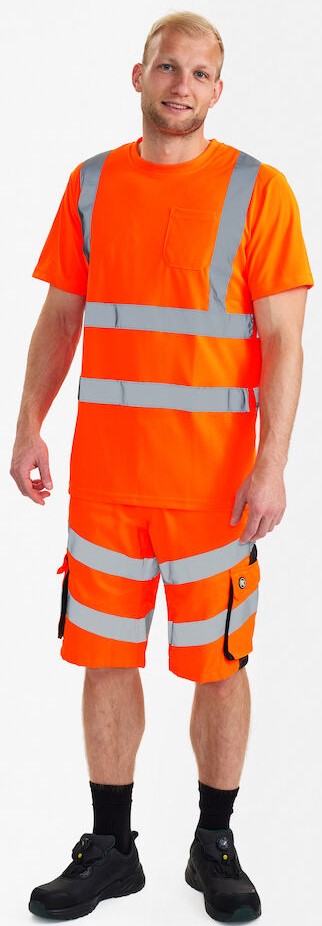 Comfortable and stylish fluorescent T-shirt made of lightweight material. Ribbed neck and pocket on the left side of the chest. Reflective stripes sewn across the shoulders and around the waist. With breast pocket. Clothing class 2, tested after 25 washes.