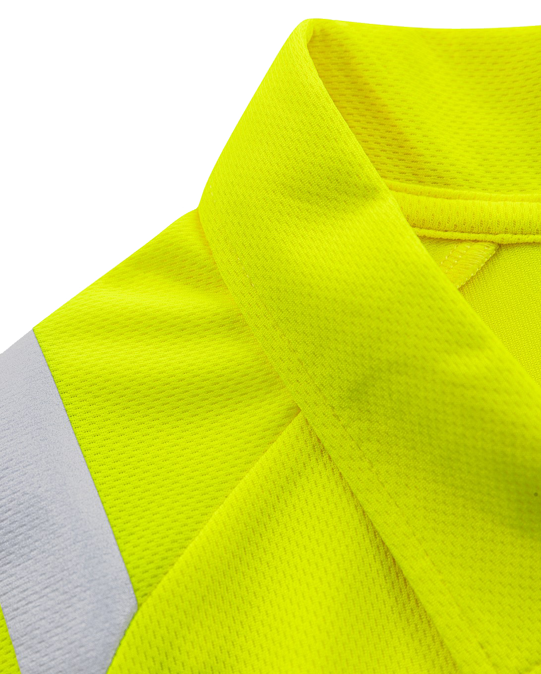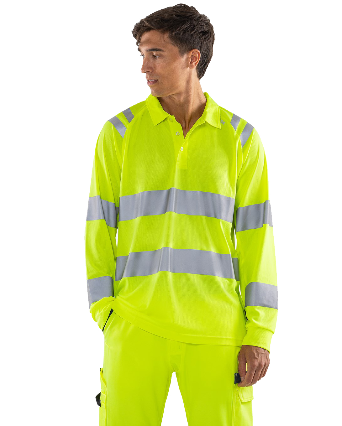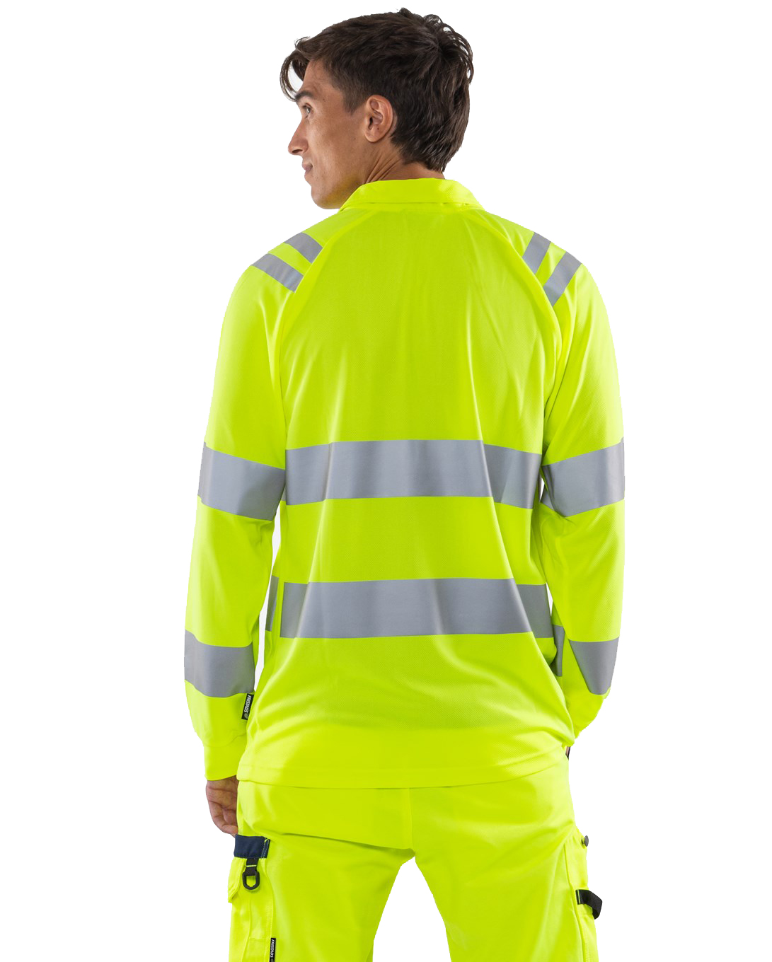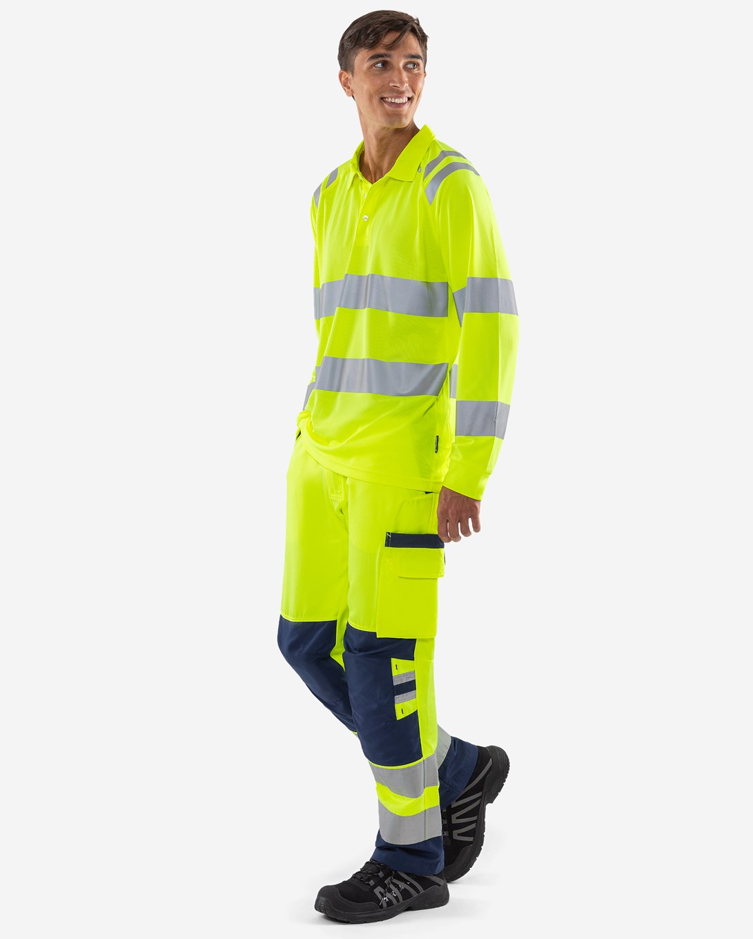 Long-sleeved high-vis polo shirt made from recycled material in a functional knit for improved breathability. The light and airy material offers high wearing comfort on warm working days. Concept: Trofta