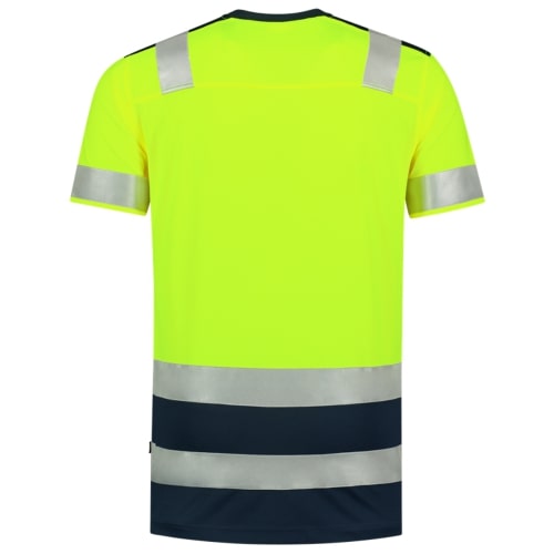 The high visibility T-shirt Bicolor is part of the Tricorp 20/20 Vision collection. The T-shirt is made of 50% polyester and 50% CoolDry polyester and offers protection from the sun with a UPF40+. The CoolDry material is characterized by its moisture-regulating and breathable properties. The T-shirt is certified to EN ISO 20471:2013 Class 1. This means that the wearer is visible and protected day and night. The T-shirt is equipped with additional reflective strips on the sleeves, guaranteeing even greater visibility. The T-shirt is washable at 60˚C and is therefore hygienically clean.