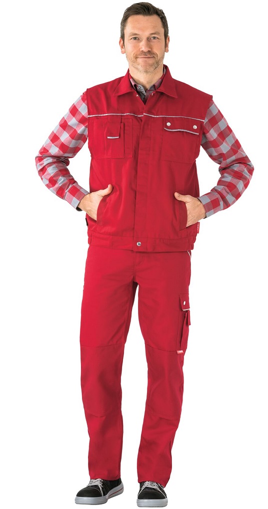 2 set-in Cordura® pouch pockets, reflective piping on shoulder saddle and pocket flaps, 2 breast pockets, left with flap and press studs, right with additional mobile phone pocket, elasticated waistband, concealed press stud front closure, hanger in collar.