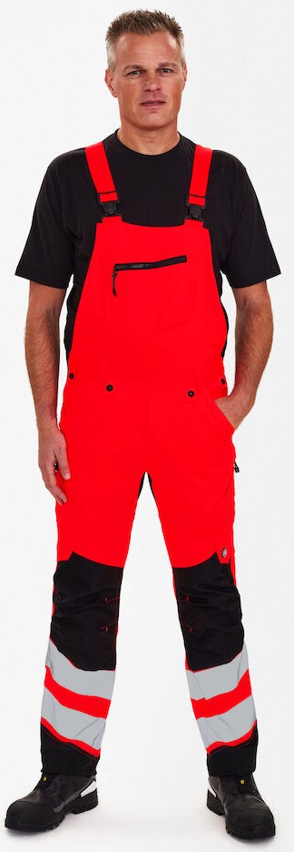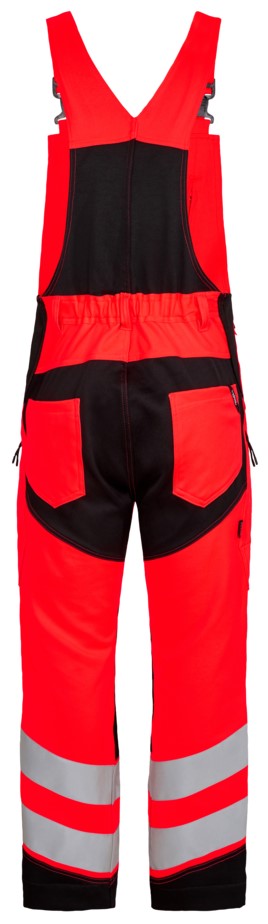 Stretchy and functional fluorescent dungarees in a modern design. The stretchy fabric ensures optimum freedom of movement and comfort. Optimum fit with ergonomically shaped knee area. High-cut back and ribbed knit inserts on the sides ensure optimum fit and comfort. Adjustable straps. Bib pocket with zipper. Inner bib pocket with zipper. Two back pockets. Two thigh pockets with zipper. The left thigh pocket has an additional cell phone pocket. The right thigh pocket has a patch ruler pocket with additional dividers. D-ring on the bib pocket for attaching ID cards, for example. Knee reinforcement/knee pocket with Velcro fastener at the bottom and made of CORDURA® material. Wide bottom hem that can be left out if extra leg length is required. Only one seam needs to be undone to lengthen the trousers. The trouser leg is still hemmed. Clothing class 2, tested after 50 washes