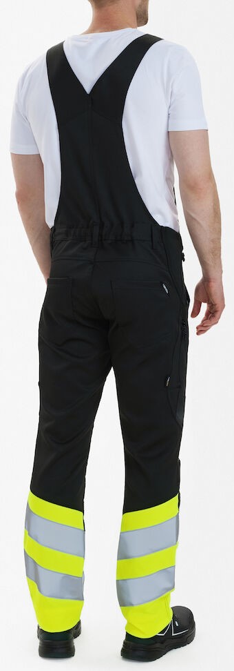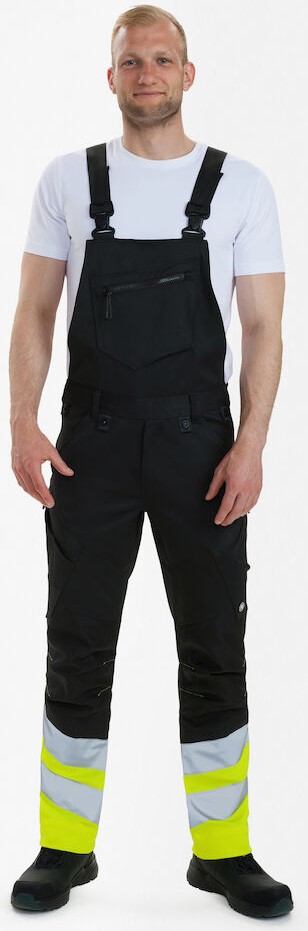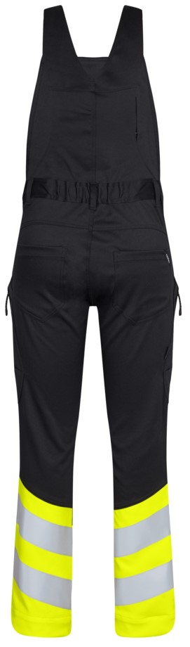 Stretchy and functional fluorescent dungarees in a modern design. The stretchy fabric ensures optimum freedom of movement and comfort. Optimum fit with ergonomically shaped knee area. High-cut back and ribbed knit inserts on the sides ensure optimum fit and comfort. Adjustable straps. Bib pocket with zipper. Inner bib pocket with zipper. Two back pockets. Two thigh pockets with zipper. The left thigh pocket has an additional cell phone pocket. The right thigh pocket has a patch ruler pocket with additional dividers. D-ring on the bib pocket for attaching ID cards, for example. Knee reinforcement/knee pocket with Velcro fastener at the bottom and made of CORDURA® material. Wide bottom hem that can be left out if extra leg length is required. Only one seam needs to be undone to lengthen the trousers. The trouser leg is still hemmed. Clothing class 2, tested after 50 washes