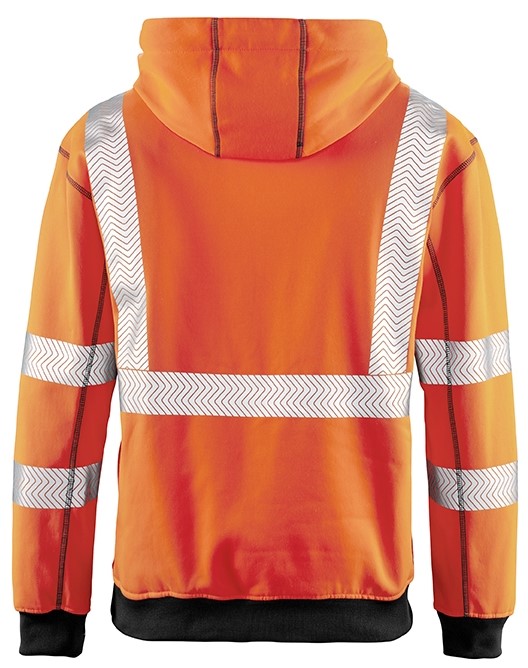 Hoodie made of comfortable to wear blended fabric. The cotton fibers lie directly on the skin and thus provide a dry and soft feeling. The robust and colorful exterior is made of recycled polyester. This means that 25 washes are easily possible without any impairment of the warning protection effect. Size M-6XL = warning protection class 3. Size XS+S= warning protection class 2. The segmented reflective stripes are directly printed on, grant a better breathability than sewn on reflective foils and are also elastic together with the outer fabric. Standards: EN ISO 13688:2013 + A1:2021 UV protection EN 13758-2:2003+A1:2006 EN ISO 20471:2013+A1:2016 High-visibility protection class 3 PPE category: Cat. II Other features: Outer material: 65% polyester (recycled), 35% cotton. Material thickness in gram/m²: 320 Hoodie made of a pleasant to wear blended fabric. The cotton fibers lie directly on the skin for a dry and soft feeling. The robust and color-intensive outside is made of polyes