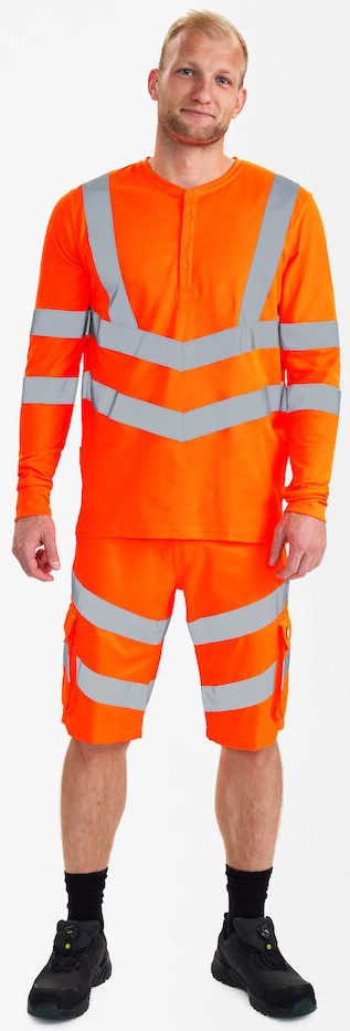 Comfortable and stylish long-sleeved T-shirt with high-visibility function in a modern design. This T-shirt has buttons and a round neckline with a small ribbed cuff. Longer at the back than at the front. Ribbed cuffs on the sleeves. The T-shirt is made from comfortable piqué fabric with cotton on the inside for added comfort. Reflective stripes across the shoulders and around the sleeves and waist. Clothing class 3, tested after 25 washes.
