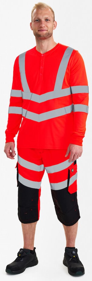 Comfortable and stylish long-sleeved T-shirt with high-visibility function in a modern design. This T-shirt has buttons and a round neckline with a small ribbed cuff. Longer at the back than at the front. Ribbed cuffs on the sleeves. The T-shirt is made from comfortable piqué fabric with cotton on the inside for added comfort. Reflective stripes across the shoulders and around the sleeves and waist. Clothing class 3, tested after 25 washes.