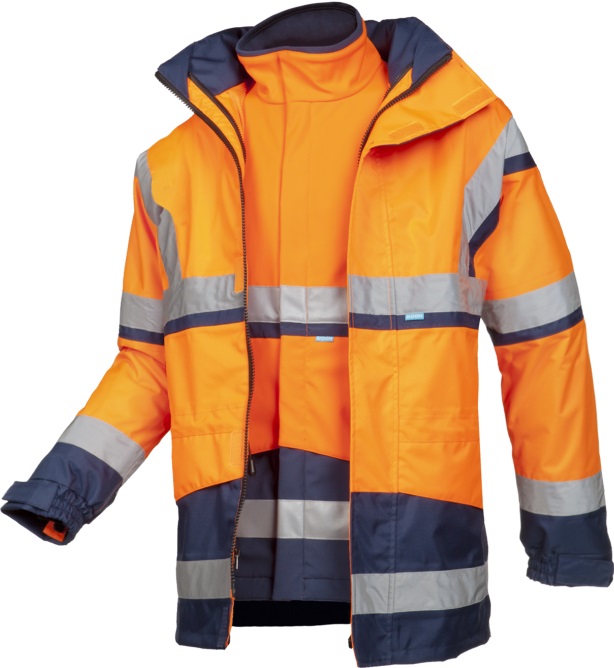 Looking for a work outfit for all weather conditions? With its removable softshell jacket, the Powell warning rain parka is perfectly tailored to your needs. This high-quality 4-in-1 model is made of a strong yet light, supple and breathable material. The rain parka with knitted cuffs on the sleeves has a removable hood, 2 pockets on the outside, 1 inside pocket and 1 Napoleon pocket. Thanks to the elastic drawstring waist and the elastic joint band with narrowing possibility you can fully adjust this light rain jacket to your body. The removable softshell jacket has 1 inside pocket and 2 side pockets. The detachable sleeves have an elastic band at the wrist.