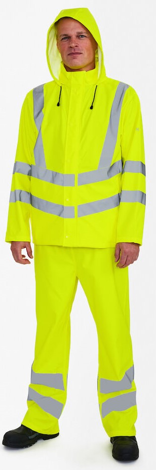 Functional rain jacket with taped seams and ventilation at the back. Zipper and Velcro fastener at the front. Two spacious and functional side pockets and large inside pockets. Detachable, adjustable hood with space for a work helmet. Possibility to adjust the sleeves. Clothing class 3, tested after 5 washes