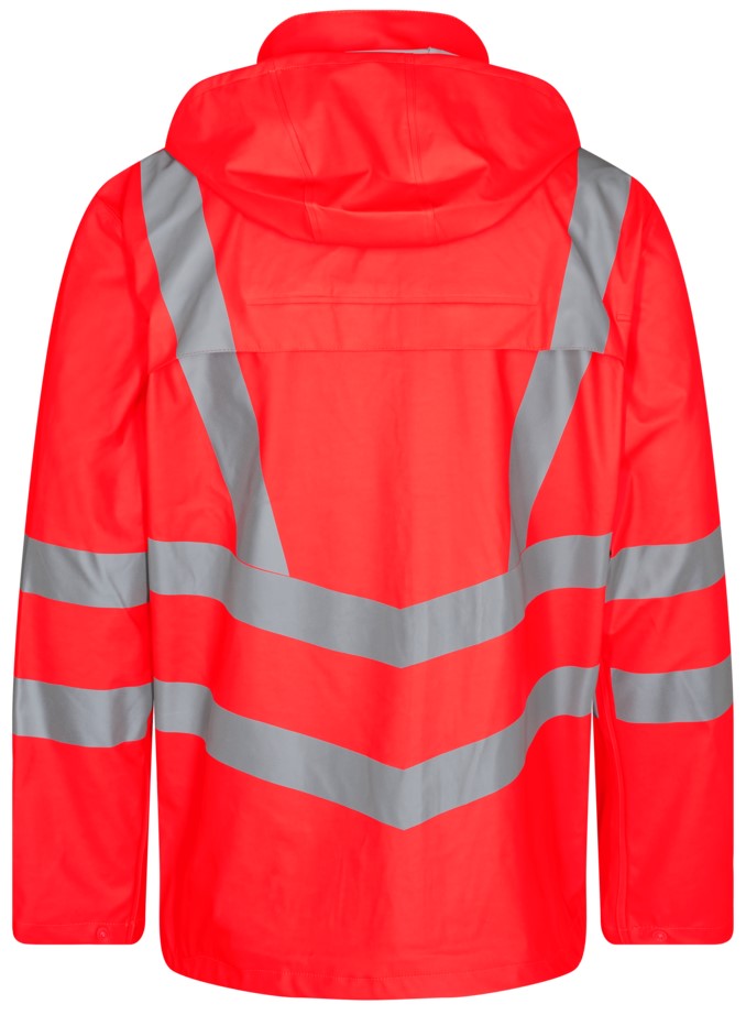 Functional rain jacket with taped seams and ventilation at the back. Zipper and Velcro fastener at the front. Two spacious and functional side pockets and large inside pockets. Detachable, adjustable hood with space for a work helmet. Possibility to adjust the sleeves. Clothing class 3, tested after 5 washes