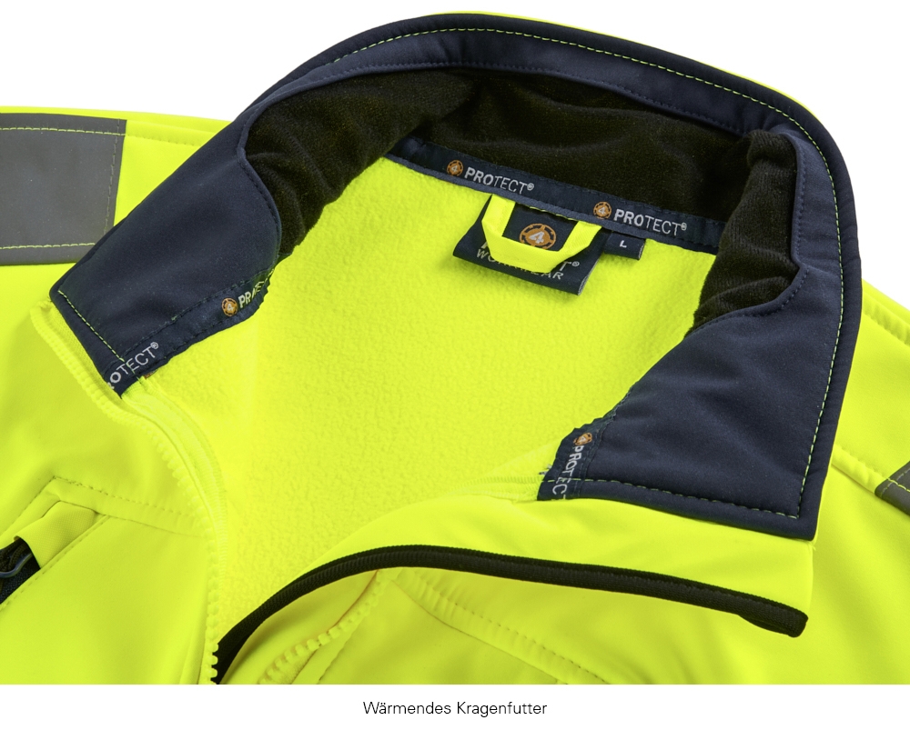 Windproof and even warmer than fleece, but much more flexible than other weatherproof clothing, the PITTSBURGH softshell jacket is the ideal choice for transitional periods or days with rapidly changing weather. Safety has also been taken into consideration: reflective strips made of original 3MSchotchlite™ 8906 fabric ensure good visibility even in poor lighting conditions. Four spacious zipped pockets, variable sleeve and waist widths and a lined collar round off the equipment.	Standard: EN ISO 20471-2	Protection class: Cat. SECOND	Water column: approx. 10,000 mm	Breathability: approx. 400 g/m"/24 h	high freedom of movement due to flexible, elastic fabric with windproof properties.	water-repellent outer layer with good breathability.	Original 3MScotchliteTM reflective stripes around body and sleeves as well as on shoulders.	Dark hem and cuff area prevents easy soiling.	underlaid front zipper with chin protection.	adjustable velcro cuffs	2 breast pockets with waterprooferdizippers	Z
