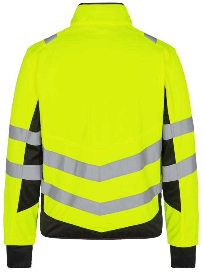 Functional, fluorescent softshell jacket in a modern, attractive design with wind and water-repellent properties. The jacket is lined with fleece on the inside and collar, making it soft and comfortable against the skin. Stretch quality for comfort and freedom of movement. Reflective zipper at the front. Two spacious side pockets and a chest pocket, each with a zipper. Two large inside pockets with Velcro fastening. The jacket has an elastic waistband at the bottom. Sleeves with elasticated wind cuffs with thumb opening. Sleeves with elasticated wind cuffs with thumb opening. Additional storm flap made of elastic material in the sleeves. The storm flap with thumb opening can be pulled over the hand to protect against the cold. Reflective stripes across the shoulders and around the sleeves and waist. Clothing class 2, tested after 25 washes.
