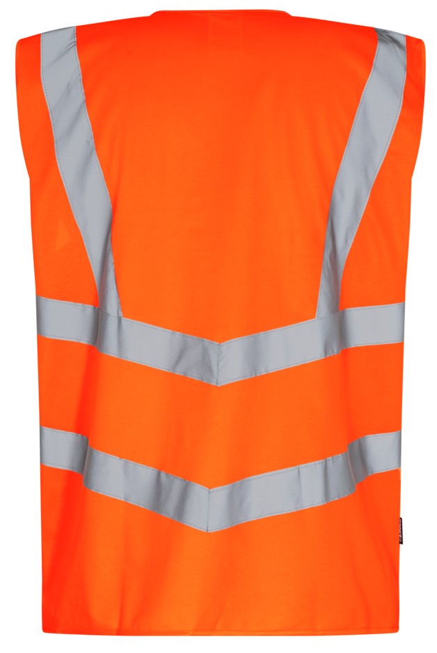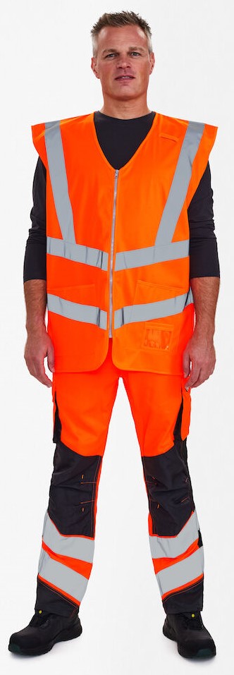Lightweight, comfortable traffic vest with front zipper. Two large outer pockets with Velcro fastener. ID card holder on the left pocket. Loop, e.g. for walkie-talkie or gas detector, on the left side of the chest. Reflective stripes on the torso and over the shoulders. Clothing class 2, tested after 25 washes.