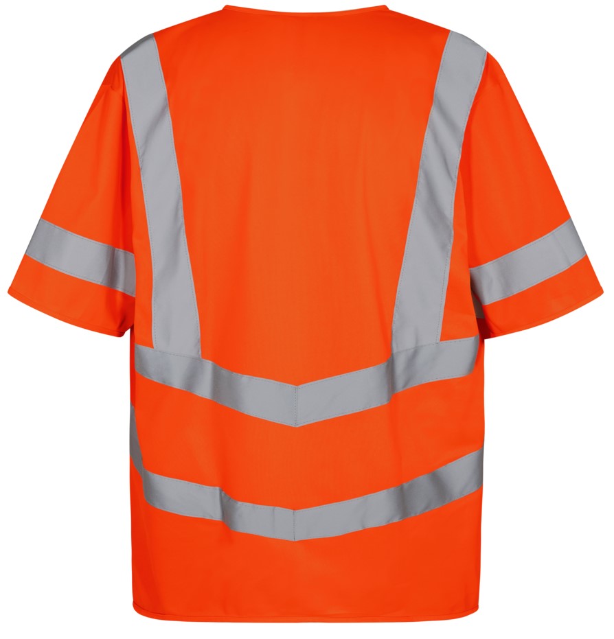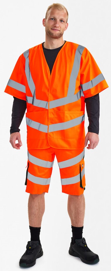 Lightweight, comfortable traffic vest with short sleeves and Velcro fastener at the front. Two large outer pockets with Velcro fastener. Reflective stripes on the torso and over the shoulders. Clothing class 3, tested after 25 washes.