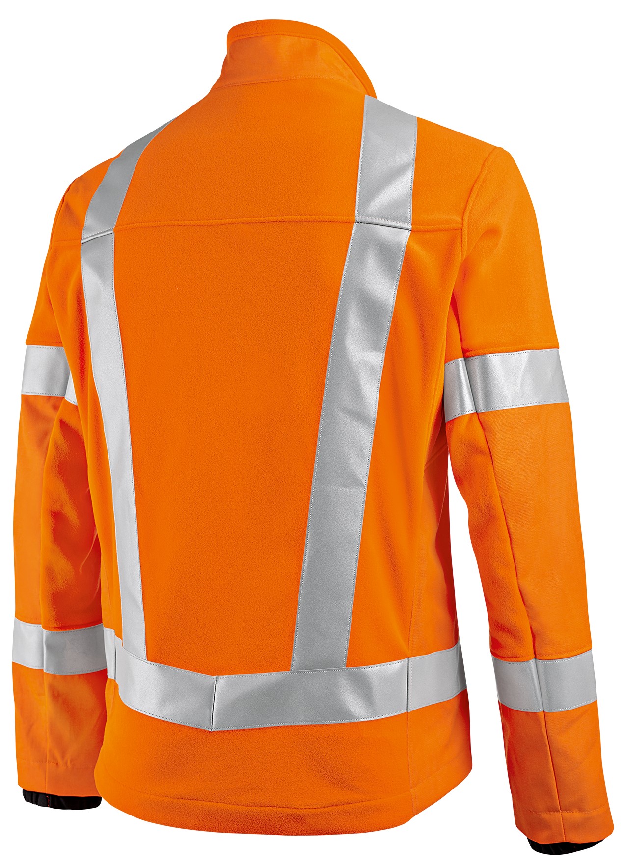 Sleeve cuffs with wind protection, extended back, with reflective stripes for 360° visibility, 2 reflective stripes on each sleeve, 1 circumferential reflective stripe above the hem, 2 circumferential vertical reflective stripes on front and back each