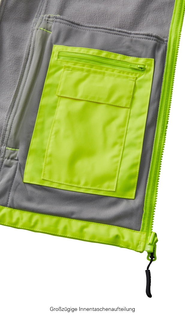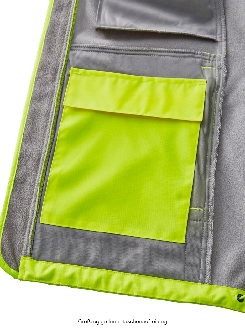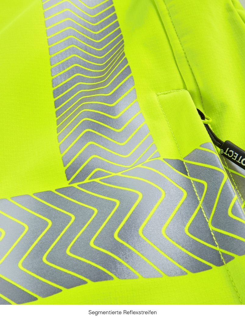 Same safety for all sizes. Even the smallest size (XS) of the TYLER softshell jacket achieves the highest safety class 3 for high-visibility protective clothing. The segmented laminated reflective strips run around the body and sleeves as well as over the shoulders (suspenders reflective strips). The innovative functional membrane guarantees that the fabric is highly waterproof and breathable. The combination of elastic fabric with a close-fitting cut and ergonomically shaped sleeves ensures an extremely high level of comfort. The ripstop fabric is robust, hard-wearing and therefore particularly durable. The high-quality overall package is rounded off by an elaborate interior with numerous storage options. Printing in maximum format possible (e.g. 110 x 70 mm chest and 260 x 100 mm back), without any negative impact on the high-visibility class. It is possible to print in accordance with the manufacturer's format specifications without any negative impact on the high-visibility classi