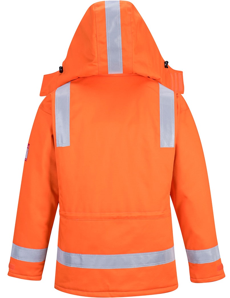 This flame retardant winter jacket is ideal for the offshore industry. Made from the same outer fabric as FR50, combined with thick insulation padding for extra heat. With double stitched reflective stripes on arms, body and shoulder. Conforms to all required EN standards, including the welding protection standard. With triple seams, concealed 2-way brass zipper and two diagonal breast pockets with flap. With drawcord for optimum fit and detachable hood.Flame retardant This industry-leading collection offers multi-standard protection for potentially explosive atmospheres. These state-of-the-art products are the result of many years of experience, state-of-the-art technology and market research. A commitment to the health, safety and comfort of the wearer can be seen in the wide range of products suitable for all weather conditions and applications.Product features: Standards EN ISO 11612 (A1+A2 B1, C1, E2, F1) EN 1149 -5 EN 342 (0.451m2.K/W(B) X,2,X) EN ISO 11611 Class 2 (A1+A2) CE c