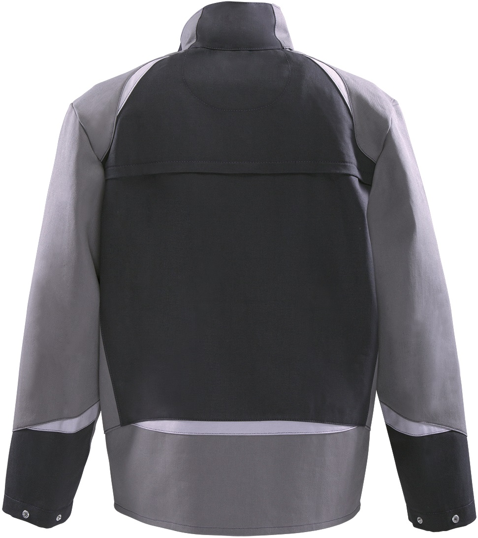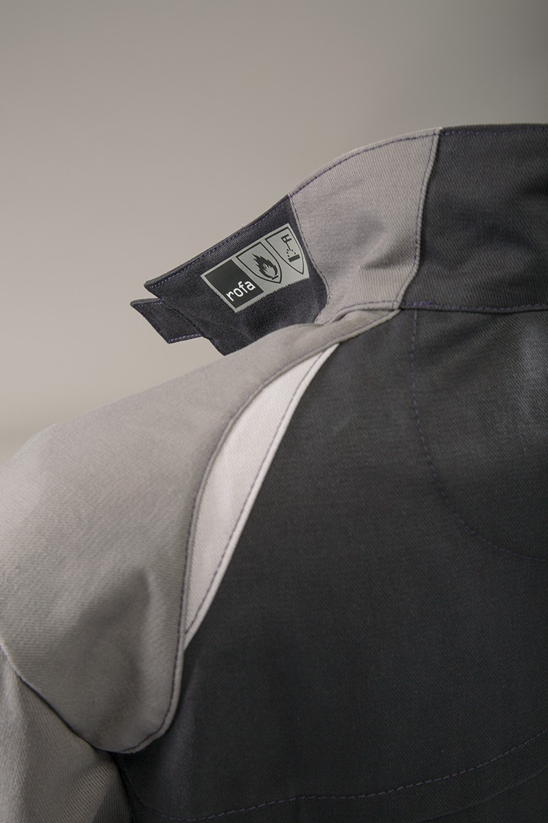 rofa SPLASH jacket in two-color design and dynamic lines is modern, offers a pleasant wearing comfort and at the same time high protection during light welding work. The biker collar with the necessary protective clothing standards in the form of well visible pictograms can be worn as a stand-up or turn-down collar. Two breast pockets with deep pocket openings, two side pockets with zips and an inside pocket with Velcro are practical and individually usable. The Proban® fabric remains even after execution: variable biker collar as stand-up collar or turn-down collar, front centre with press studs, 2 breast pockets with flap and Velcro, sleeve ends width-adjustable by press studs, 2 side pockets with zip, 1 inside pocket left with Velcro, applications on body and sleeves, Proban®material/quality: Fabric 91, twill, 100% cotton, approx. 330 gsm, FRColours available: 431 navy grain blue, 537dark anthracite grey Sizes available: 44 - 66, 90 - 114