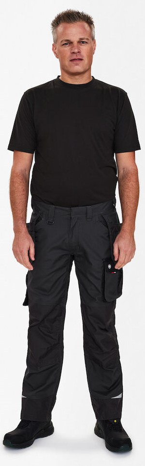 Functional work trousers with many details. Optimum fit, including ergonomically shaped knees and a panel on the inseam in the crotch for greater comfort. Two spacious, slanted slit pockets and two holster pockets at the front. Loop with D-ring (front) for attaching an ID card. Two spacious back pockets with flap and Velcro fastener. Thigh pocket with zipper pocket for cell phone, additional small pocket. It is spacious and provides more freedom of movement thanks to the free-hanging bottom. Reinforced ruler pocket at the bottom with additional compartments. The ruler pocket also has a free-hanging bottom. Knee reinforcement/knee pocket with Velcro fastener at the bottom and two adjustment options for knee pads. Reinforced hem at the back and front of the trouser legs for extra wear resistance. Reflective strips on the knees and at the bottom of the trouser legs for increased visibility. Suitable for industrial laundering.