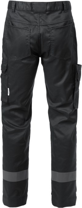 Comfortable pants with pockets and features designed specifically for the service sector. Reflective tape at the ends of the legs increases visibility. Made of a lightweight, flexible material that offers great freedom of movement. Product description: Material:65% polyester, 35% cotton Weight:260 g/m² Mechanical stretch quality / Concealed button placket / 2 front pockets / 2 back pockets One large leg pocket and document pocket with flap and Velcro / One leg pocket with flap and Velcro, cell phone pocket with flap and Velcro and 2 pen pockets Reflective tape at leg end / Leg length adjustable with 5 cm hem allowance Suitable for industrial washing according to ISO 15797 OEKO-TEX STANDARD 100 color: black Sizes: C42-C66, D84-D120