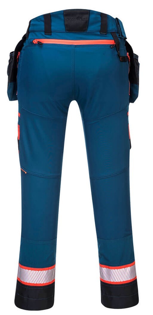 The DX4 ladies' waistband trousers with detachable high-vis holster are ergonomically designed and use the targeted placement of dynamic 4X stretch fabrics to ensure maximum freedom of movement when working. The trousers have a raised back waistband with elasticated sides to ensure protection in all working positions. Triple stitched seams for maximum durability.