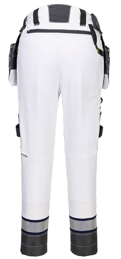 The DX4 ladies' waistband trousers with detachable high-vis holster are ergonomically designed and use the targeted placement of dynamic 4X stretch fabrics to ensure maximum freedom of movement when working. The trousers have a raised back waistband with elasticated sides to ensure protection in all working positions. Triple stitched seams for maximum durability.