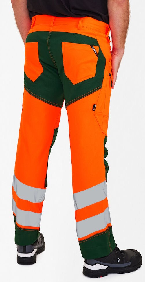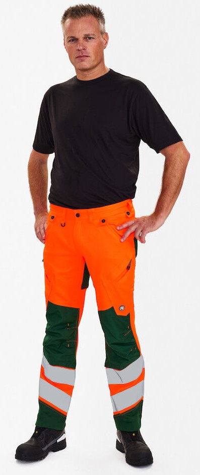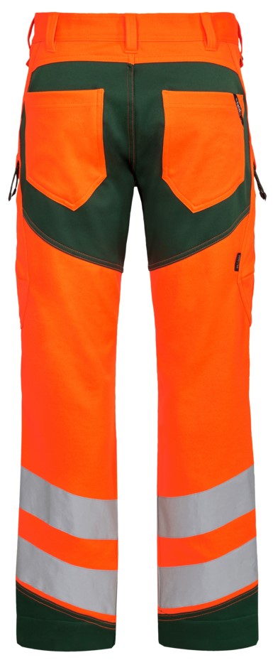 Stretchy, functional and fluorescent trousers in a modern design. Optimum fit with ergonomically shaped knee area. The stretchy fabric ensures optimum freedom of movement and comfort. D-ring at the front for attaching ID cards, for example. Two spacious slanted front pockets. Two back pockets. Two thigh pockets with zippers. The left thigh pocket has an additional cell phone pocket. The right thigh pocket has an attached reinforced ruler pocket with additional dividers. Knee reinforcement/knee pocket with Velcro fastener at the bottom and made of CORDURA® material. Reflective stripes on the lower leg. Wide bottom hem that can be left out if extra leg length is required. Only one seam needs to be undone to lengthen the trousers. The trouser leg is still hemmed. Clothing class 2, tested after 50 washes.
