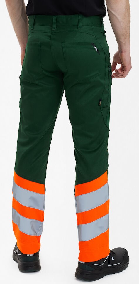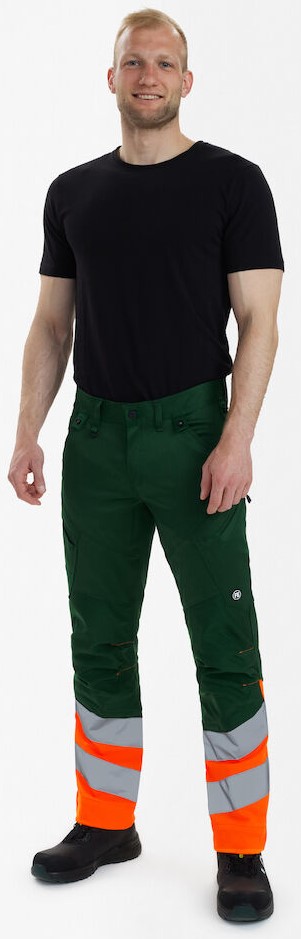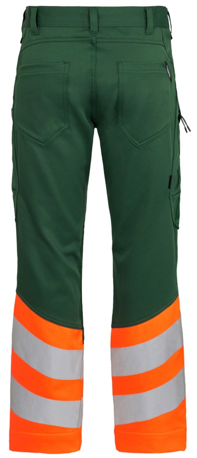 Stretchy, functional and fluorescent trousers in a modern design. Optimum fit with ergonomically shaped knee area. The stretchy fabric ensures optimum freedom of movement and comfort. D-ring at the front for attaching ID cards, for example. Two spacious slanted front pockets. Two back pockets. Two thigh pockets with zippers. The left thigh pocket has an additional cell phone pocket. The right thigh pocket has a patch ruler pocket with additional dividers and a knife pocket, both pockets are reinforced. Knee reinforcement/knee pocket with Velcro fastener at the bottom and made of CORDURA® material. Reflective stripes on the lower leg. Wide bottom hem that can be left out if extra leg length is required. Only one seam needs to be undone to lengthen the trousers. The trouser leg is still hemmed. Clothing class 1, tested after 50 washes.
