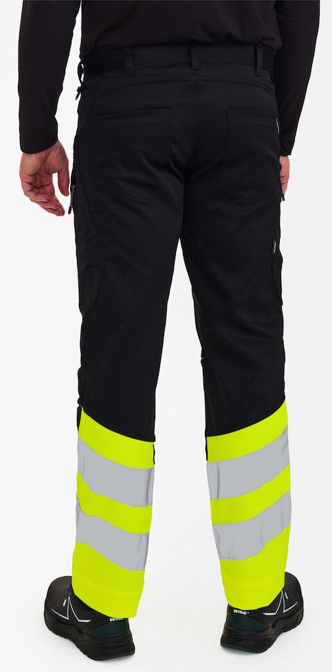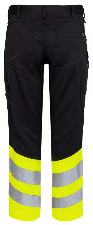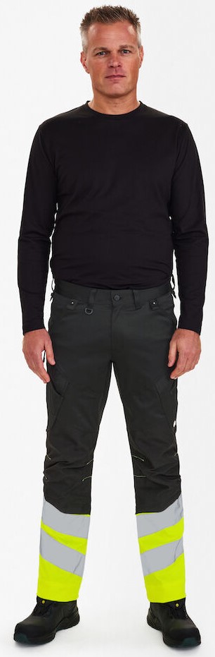 Stretchy, functional and fluorescent trousers in a modern design. Optimum fit with ergonomically shaped knee area. The stretchy fabric ensures optimum freedom of movement and comfort. D-ring at the front for attaching ID cards, for example. Two spacious slanted front pockets. Two back pockets. Two thigh pockets with zippers. The left thigh pocket has an additional cell phone pocket. The right thigh pocket has a patch ruler pocket with additional dividers and a knife pocket, both pockets are reinforced. Knee reinforcement/knee pocket with Velcro fastener at the bottom and made of CORDURA® material. Reflective stripes on the lower leg. Wide bottom hem that can be left out if extra leg length is required. Only one seam needs to be undone to lengthen the trousers. The trouser leg is still hemmed. Clothing class 1, tested after 50 washes.