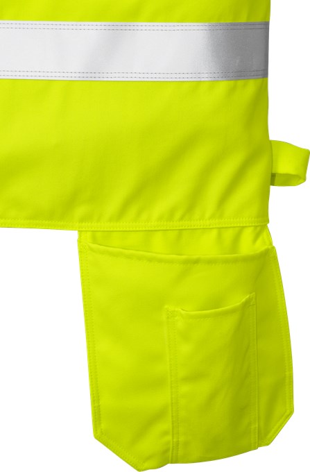 Standards: EN 61482-1-2 Class 1 EN 61482-1-1 EBT: 12.8 cal/cm² HAF: 84.2% EN ISO 11612 A1 B1 C1 F1 EN 1149-5 EN ISO 20471 Class 2 ISO 15797 Other features: Colour: high-visibility yellow (130) Material: 45% modacrylic, 35% cotton, 18% polyamide, 2% carbon. Inherent flame protection Reinforcements: 79% cotton (flame retardant), 20% polyamide, 1% carbon Weight: 300 g/m² Dirt, oil and water repellent reflective stripes over the shoulder Concealed zip with press stud placket 2 loose hanging breast pockets with press stud fastening - one with flap, D-ring and concealed press stud fastening 2 front pockets, 2 CORDURA®-reinforced, insertable, loose hanging outer pockets - one with extra pocket, the other with 3 pockets and tool loops 2 CORDURA®-reinforced loose hanging back pockets, both with extra tool pocket 2 hammer loops Approved after 50 washes Suitable for industrial laundering according to ISO 15797 Material tested and approved according to EN 13034 OEKO-TEX® certified Sizes: X