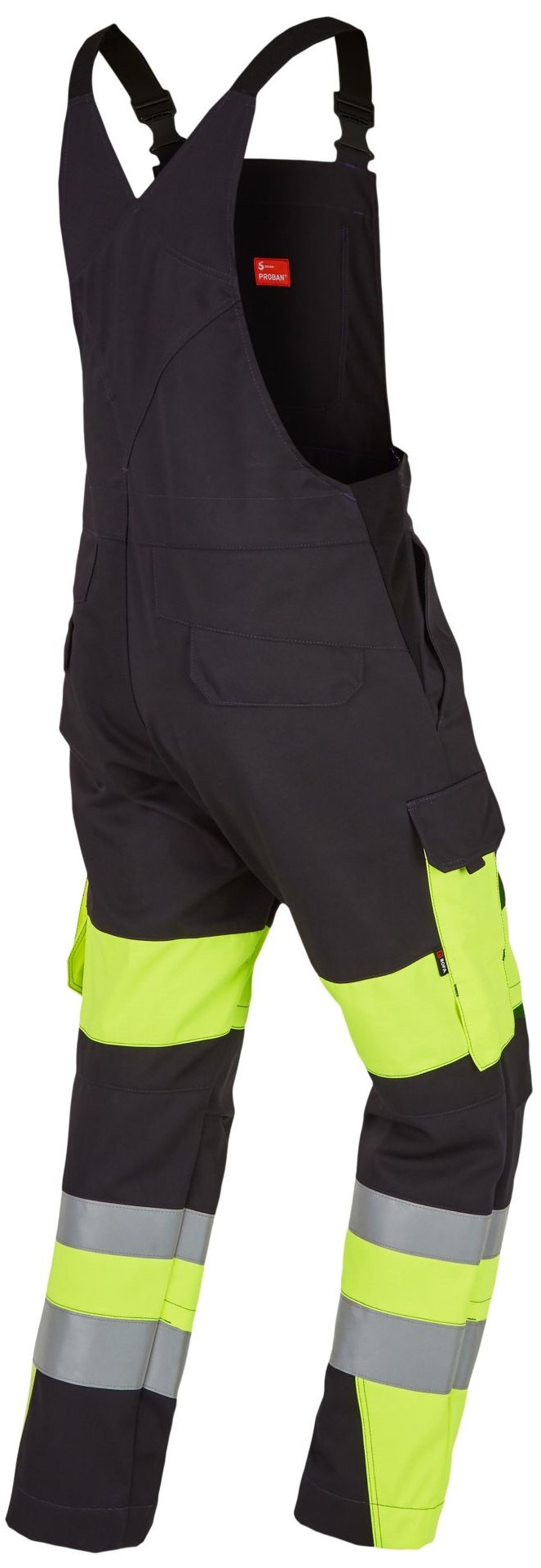The ROFA VIS-LINE I dungarees made of flame-retardant Proban® fabric offer a high level of protection when exposed to heat and flames and are particularly suitable for work where high visibility is required. The dungarees provide protection during welding work and work involving the risk of electric arcs. In addition, the dungarees have electrostatic dissipative properties and protect against small amounts of sprayed or splashed chemicals. The stretch straps and the waistband with lateral stretch insert provide optimum support. Well thought-out pocket solutions, such as the patch smartphone pocket or the folding rule pocket, are practical and offer sufficient storage space. The integrated knee pockets for pads protect the knees even during heavy use. The reflective stripes ensure a dynamic appearance and optimal visibility. The Scandinavian hem allows for easy trouser leg extension.