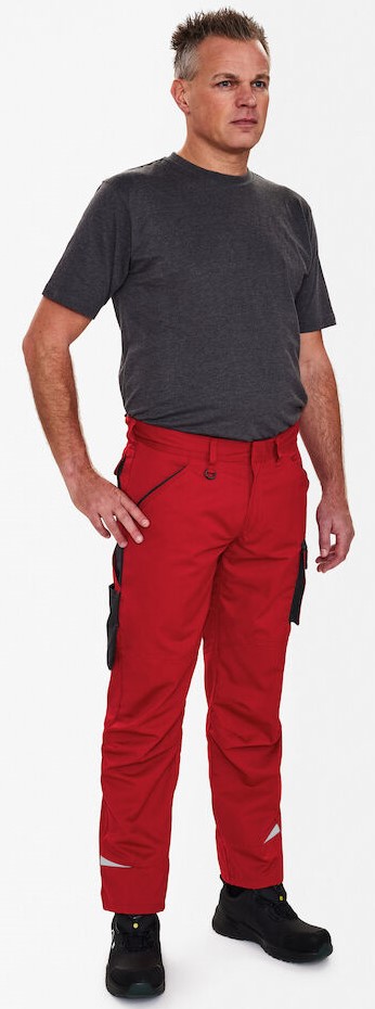 Funktionelle Arbeitshose mit vielen Details. Optimale Passform, u. a. sorgen ergonomisch geformte Knie und Panel an der Innennaht im Schritt für mehr Bequemlichkeit. Zwei geräumige, schräg sitzende Einschubtaschen vorne. Schlaufe mit D-Ring (vorne) zur Befestigung einer ID-Karte. Zwei geräumige Gesäßtaschen, die rechte mit Patte und Klettverschluss. Schenkeltasche mit Reißverschlusstasche fürs Handy, zusätzliche kleine Tasche. Zollstocktasche mit zusätzlichen Fächern. Die Zollstocktasche hat einen freihängenden Boden. Reflexstreifen unten an den Hosenbeinen für mehr Sichtbarkeit. Für Industriewäsche geeignet.