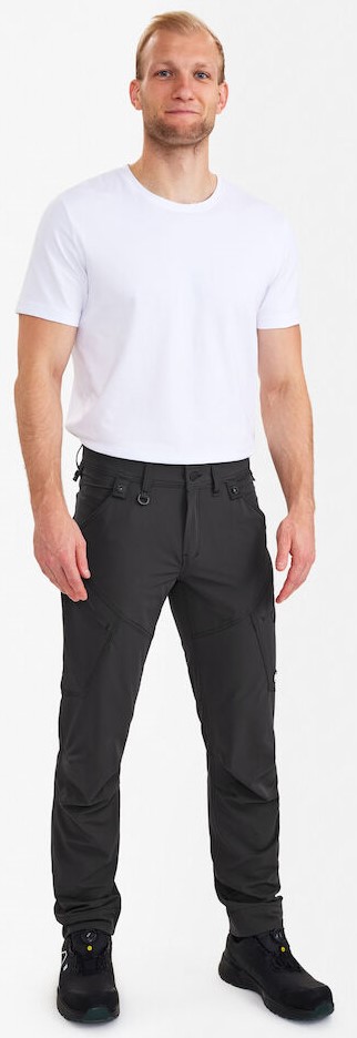 Funktionelle Servicehose mit vielen funktionellen Details. Der Stoff ist mit bequemem 4-Wege-Stretch für bessere Passform und mehr Bewegungsfreiheit und für maximalen Komfort mit Baumwolle auf der Innenseite ausgestattet. Die Hose hat einen ergonomisch geformten Kniebereich. Zwei geräumige Schrägtaschen vorne. Zwei Gesäßtaschen. Zwei Schenkeltaschen mit Reißverschluss. Die linke Schenkeltasche hat eine zusätzliche Handytasche. Die rechte Schenkeltasche hat Falten für zusätzliche Weite und eine Innentasche. D-Ring vorne für die Befestigung von z. B. Ausweisen. Breiter Saum unten, der ausgelassen werden kann, wenn zusätzliche Beinlänge erforderlich ist. Um die Hose zu verlängern, muss lediglich eine Naht aufgetrennt werden. Das Hosenbein ist trotzdem noch gesäumt.