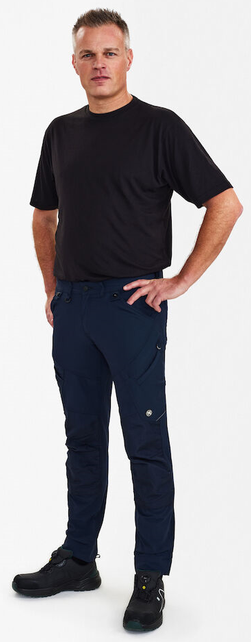 Funktionelle Handwerkerhose mit einer modernen Passform und vielen praktischen Details. Optimale Passform mit u.a. ergonomisch geformtem Kniebereich. 4-Wege-Stretch sorgt für bessere Passform und mehr Bewegungsfreiheit. Für maximalen Komfort ist diese Hose innen mit Baumwolle ausgestattet. Am D-Ring auf der Vorderseite kann man z. B. einen Ausweis befestigen. Zwei geräumige Schrägtaschen vorne. Zwei Gesäßtaschen. Zwei Schenkeltaschen mit Reißverschluss. Die linke Schenkeltasche hat eine extra Handytasche und die rechte Schenkeltasche zusätzliche Unterteilungen. Knöpfe für das leichte Anbringen von Hängetaschen. Zwei breite Klettbänder am Taillenbund für die schnelle Befestigung eines Werkzeughalters. Knieverstärkung/Knietasche mit Klettverschluss unten und zwei Einstellmöglichkeiten zur Höhenverstellung des Kniepolsters. Knieverstärkung aus strapazierfähigem CORDURA®. Breiter Saum unten, der ausgelassen werden kann, wenn zusätzliche Beinlänge erforderlich ist. Um die Hose zu verlängern, muss lediglich eine Naht aufgetrennt werden. Das Hosenbein ist trotzdem noch gesäumt.
