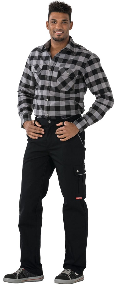 2 eingesetzte Beuteltaschen, rechts doppelte Maßstabtasche, Reflexbiesen an den Tascheneingriffen und den Taschenpatten, links Oberschenkeltasche mit Patte und Druckknöpfen, darauf aufgesetzte Handytasche, Gummizug im Bund, rechts 1 verstärkte Gesäßtasche, Rundbund mit 7 Gürtelschlaufen und Jeansknopf, Reißverschluss im Hosenschlitz.