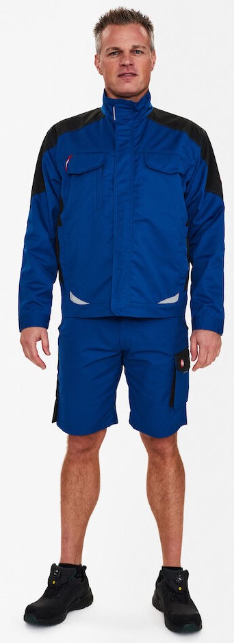 Funktionelle Arbeitsjacke mit vielen Details. Verlängerte Rückenpartie mit Bewegungsfalte. Verdeckter Reißverschlussvorn. Zwei geräumige Einschubtaschen. Zwei Brusttaschen mit Patte – rechts mit Schlaufe und D-Ring zur Befestigung einer ID-Karte und mit zusätzlicher Reißverschlusstasche fürs Handy. Zwei große Innentaschen mit Klettverschluss. Verstellbare Ärmelbündchen. Reflektoren vorne und am Rücken für mehr Sichtbarkeit. Für Industriewäsche geeignet.