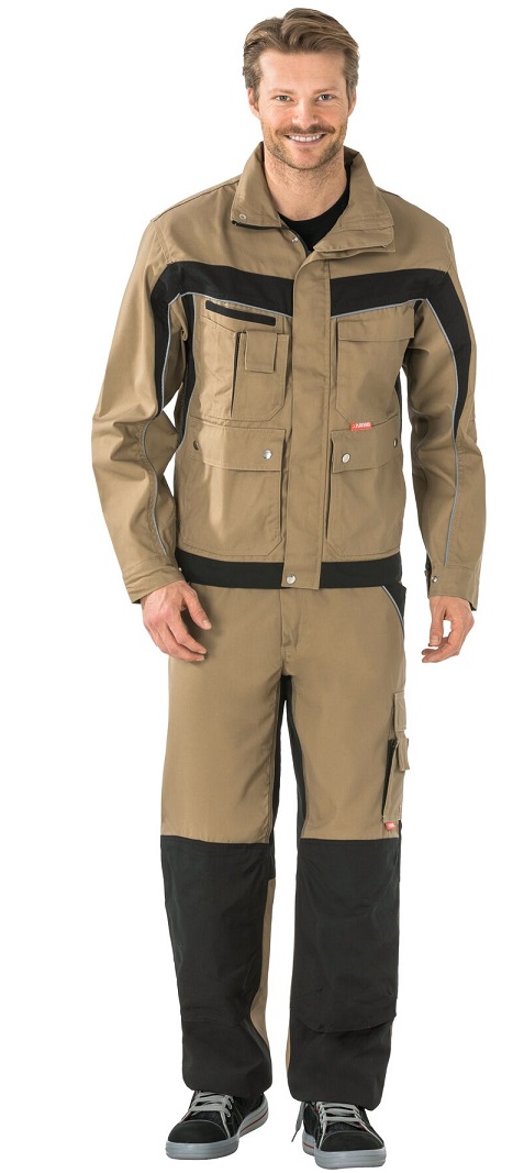 2 aufgesetzte Seitentaschen mit Patte und Druckknöpfen, 1 Brusttasche links mit Patte und Klettverschluss, doppelte Brusttasche rechts, Handytasche auf der rechten Brust, 2 Stiftfächer, mit Druckknopf verstellbare Ärmelbündchen, verdeckter Frontreißverschluss, Stehkragen, Bundweite mit Klettband verstellbar,Ärmeltasche links, Reflexbiesen als Sicherheitsausstattung, 2 Golffalten im Rücken, Lüftungsschlitz im Rücken.