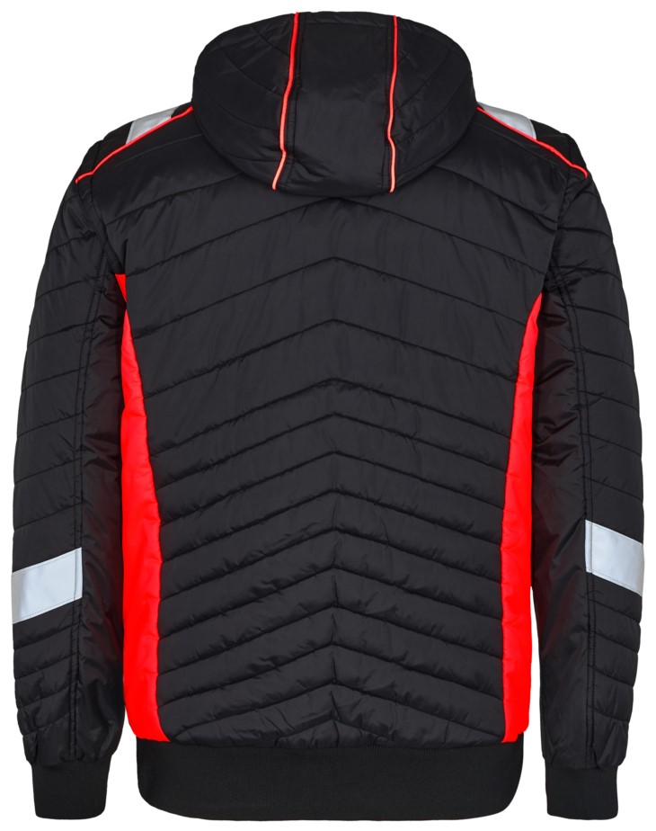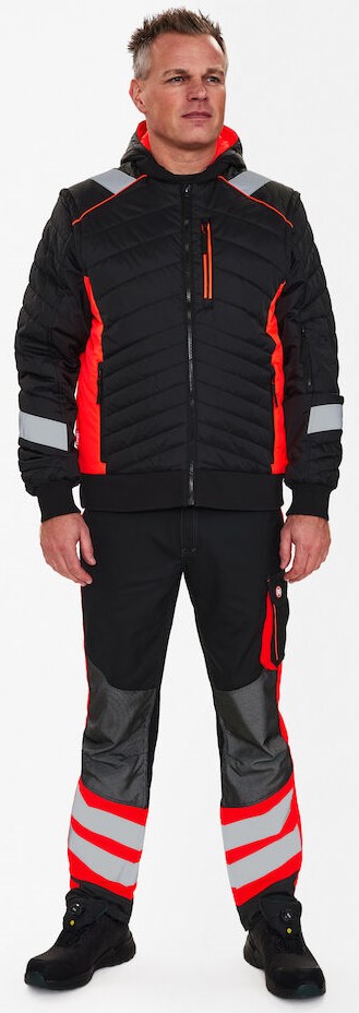 Warme Steppjacke. Frontreißverschluss. Zwei geräumige Einschubtaschen und Brusttasche, alle mit Reißverschluss. Praktische Innen- und Ärmeltasche mit Reißverschluss. Abnehmbare Kapuze und Ärmel. Die Jacke hat Strickbündchen an Bund und Ärmeln, sodass weniger Wind eindringt. Die Jacke ist nicht gemäß EN ISO 20471 zertifiziert, hat aber Reflexstreifen um die Ärmel und über die Schultern sowie Details aus fluoreszierendem Material für mehr Sichtbarkeit.