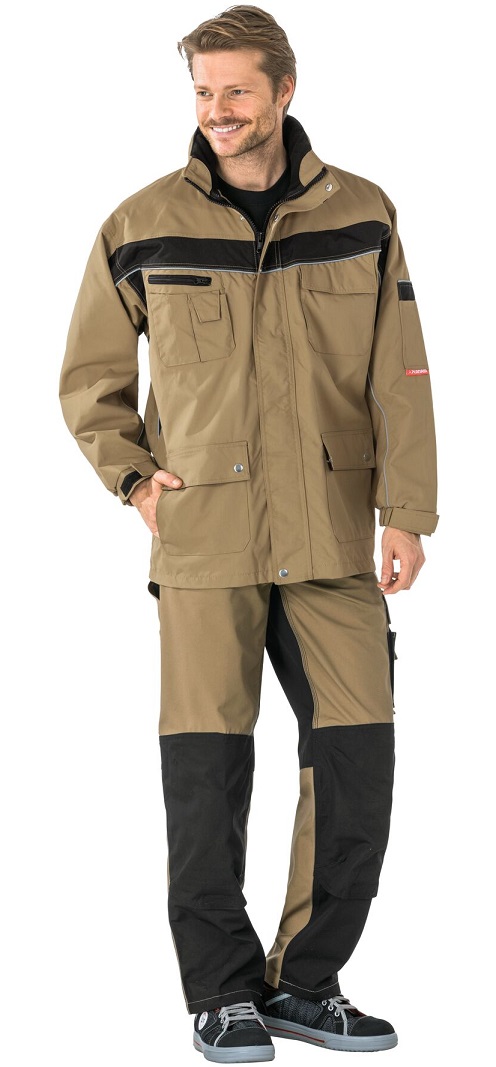 Atmungsaktiv, wasserdicht, Nähte hinterklebt, Fleecekragen, Reflexbiesen als Sicherheitsausstattung, Kapuze im Kragen, 1 Brusttasche links mit Patte und Klettverschluss, doppelte Brust-tasche rechts, Handytasche auf der rechten Brust, 2 Stiftfächer, 2 seitliche Einschubtaschen, 2 aufgesetzte Seitentaschen, Ärmeltasche links, Dokumententasche unter der Frontpatte, Netzfutter innen, verdeckter Frontreißverschluss, mit Klettverschluss verstellbare Ärmelbündchen.
