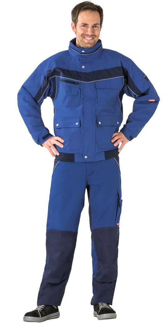 Atmungsaktiv, wasserdicht, Nähte hinterklebt, Fleecekragen, Reflexbiesen als Sicherheitsausstattung, Kapuze im Kragen, 1 Brusttasche links mit Patte und Klettverschluss, doppelte Brusttasche rechts, Handytasche auf der rechten Brust, 2 Stiftfächer, 2 seitliche Einschubtaschen, 2 aufgesetzte Seitentaschen, Ärmeltasche links, Dokumententasche unter der Frontpatte, Innenfutter gesteppt, verdeckter Frontreißverschluss, Strickbündchen am Bund, elastische Ärmelbündchen durch Klettband verstellbar.