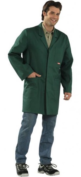Individuell für jede Arbeitsstelle. Kragen mit Revers, 2 Seitentaschen, 1 Brusttasche, 1 Innentasche, verdeckte Knopfleiste, Wechselknöpfe, Rückengurt.