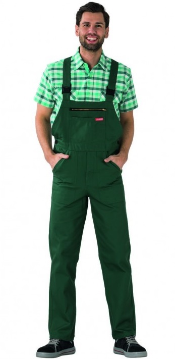 Brustlatz mit Messing-Reißverschluss, zusätzlich aufgesetzte Latztasche, 2 aufgesetzte, verstärkte Vordertaschen, 1 Gesäßtasche, 1 Maßstabtasche, verstellbare Seitenschlitze, Hosenschlitz mit Reißverschluss, hochgezogenes Rückenteil mit solide konstruiertem elastischen Zwischenteil, Sicherheitsschnallen an den Trägern.