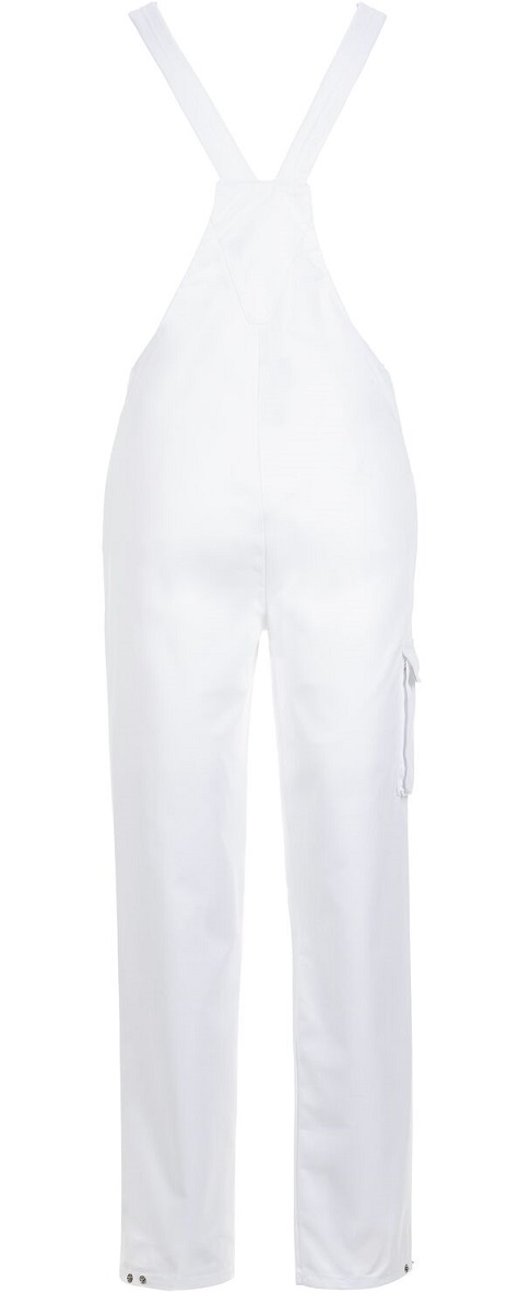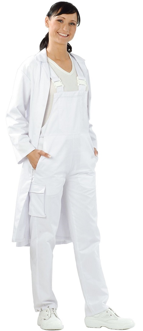 Dieser Einteiler mit vielen Verstellmöglichkeiten bietet hohe Hygienesicherheit durch die verdeckten Tascheneingriffe und passt sich durch die vielen Verstellmöglichkeiten individuell an. Angelehnt an die Empfehlungen der HACCP und der DIN 10524 für Lebensmittelhygiene. Brustlatz mit Tasche innen liegend, 2 eingesetzte Beuteltaschen, mit Patten und Druckknöpfen zu verschließen, 1 Oberschenkeltasche rechts mit Patte und Druckknopf, elastische Einsätze an den Seiten, Sicherheitsschnallen an den Trägern, Fußweite mit Druckknopf zu verstellen.