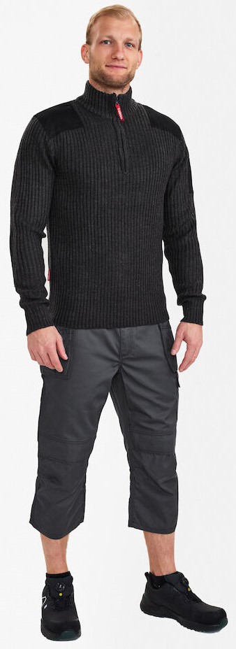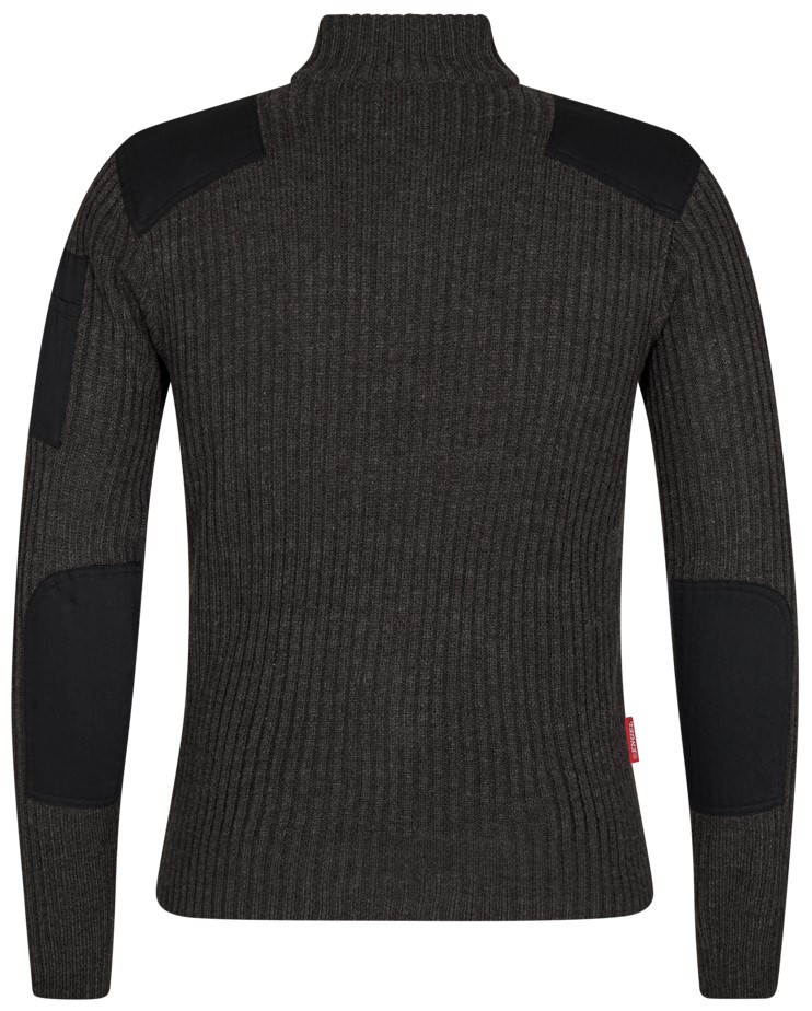 Bequemer Rippstrickpullover mit hohem Kragen und Reißverschluss. Schultern und Ellenbogen sind mit Canvas verstärkt. Tasche mit Einschub für z. B. Stifte am linken Ärmel.