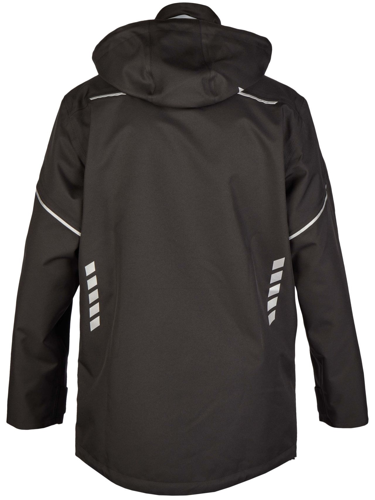 Ausführung: Stehkragen mit abknöpfbarer Kapuze, vordere Mitte mit Zwei-Wege-Reißverschluss, vordere Leiste mit Druckknöpfen und Regenablaufrinne, 2 Brusttaschen mit Patte und Klett, Ärmelabschluss weitenverstellbar durch Riegel mit Klett, 2 Seitentaschen mit Reißverschluss, links Napoleontasche mit Reißverschluss, 2 Innentaschen mit Klett, Service-Reißverschluss, Reflexapplikationen am Rumpf und Kapuze, Reflexpaspel an Brusttaschen