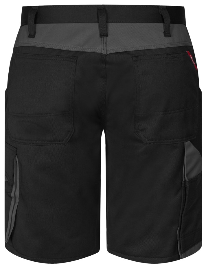Arbeitsshorts mit dreifachen Kappnähten und Bundfalten. Zwei Eingrifftaschen und eine Münztasche. Hosenschlitz mit Metallreißverschluss. Dunkel gefärbter Metallhosenknopf. Zwei Gesäßtaschen, die Rechte mit Klettverschluss. Verstärkte Zollstocktasche mit Dehnfalte rechts. Schenkeltasche und Handytasche mit Dehnfalten und Patte mit Klettverschluss und zusätzlichen Bleistifttaschen links. Für Industriewäsche geeignet.