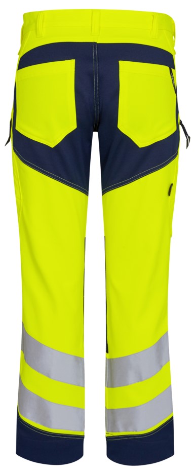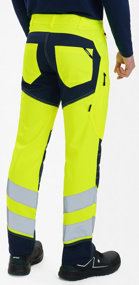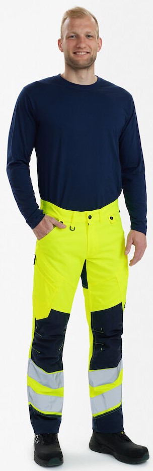 Dehnbare, funktionelle und fluoreszierende Hose im modernen Design. Optimale Passform mit u. a. ergonomisch geformtem Kniebereich. Der dehnbare Stoff sorgt für optimale Bewegungsfreiheit und Komfort. D-Ring vorne für die Befestigung von z. B. Ausweisen. Zwei geräumige Schrägtaschen vorne. Zwei Gesäßtaschen. Zwei Schenkeltaschen mit Reißverschluss. Die linke Schenkeltasche hat eine zusätzliche Handytasche. Die rechte Schenkeltasche hat eine aufgesetzte verstärkte Zollstocktasche mit zusätzlichen Unterteilungen. Knieverstärkung/Knietasche mit Klettverschluss unten und besteht aus CORDURA®-Material. Reflexstreifen am Unterschenkel. Breiter Saum unten, der ausgelassen werden kann, wenn zusätzliche Beinlänge erforderlich ist. Um die Hose zu verlängern, muss lediglich eine Naht aufgetrennt werden. Das Hosenbein ist trotzdem noch gesäumt. Bekleidungsklasse 2. Nach 50 mal Waschen getestet.