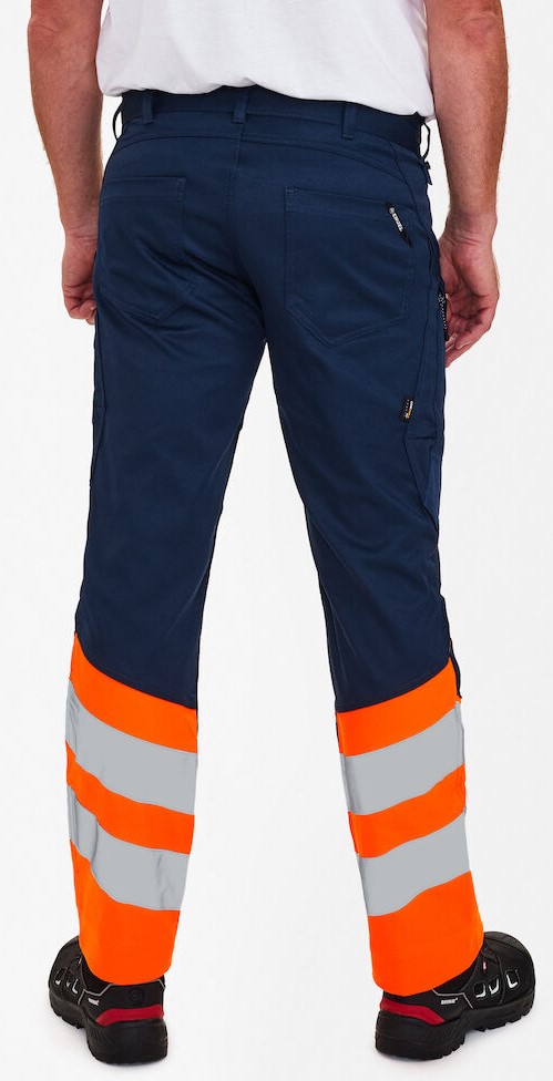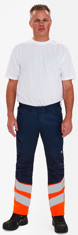 Dehnbare, funktionelle und fluoreszierende Hose im modernen Design. Optimale Passform mit u. a. ergonomisch geformtem Kniebereich. Der dehnbare Stoff sorgt für optimale Bewegungsfreiheit und Komfort. D-Ring vorne für die Befestigung von z. B. Ausweisen. Zwei geräumige Schrägtaschen vorne. Zwei Gesäßtaschen. Zwei Schenkeltaschen mit Reißverschluss. Die linke Schenkeltasche hat eine zusätzliche Handytasche. Die rechte Schenkeltasche hat eine aufgesetzte Zollstocktasche mit zusätzlichen Unterteilungen sowie eine Messertasche, beide Taschen sind verstärkt. Knieverstärkung/Knietasche mit Klettverschluss unten und besteht aus CORDURA®-Material. Reflexstreifen am Unterschenkel. Breiter Saum unten, der ausgelassen werden kann, wenn zusätzliche Beinlänge erforderlich ist. Um die Hose zu verlängern, muss lediglich eine Naht aufgetrennt werden. Das Hosenbein ist trotzdem noch gesäumt. Bekleidungsklasse 1. Nach 50 mal Waschen getestet.