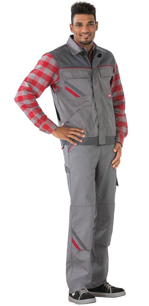 2 aufgesetzte Seitentaschen, 2 Brusttaschen mit Patte und Klettverschluss, farbliche Applikationen auf der rechten Brusttasche, Gummizug im Bund, verdeckter Frontreißverschluss, Biese am Sattel, 2 Golffalten im Rücken.